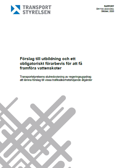 Förarbevis för vattenskoter inte i sikte. Förarbevis vattenskoter är ännu inte obligatoriskt men transportstyrelsen har på uppdrag av regeringen delgivit en rapport där de anser att detta bör införas. Även vattenskoter är ett fartyg, och inbegrips såklart i dessa regler. Dessutom finns flera andra om du nu har ett förarintyg, kan detta till en början omvandlas till ett förarbevis för vattenskoter. Det är hög tid att införa förarbevis för vattenskoter på samma sätt som för snöskoter, skriver elisabet rydbeck.